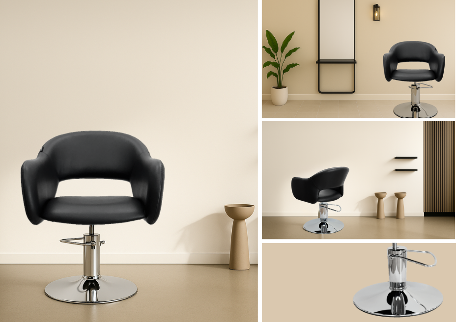 Elevate your studio with a chair that’s as stylish as it is supportive — designed to inspire confidence, comfort, and class. The Nora Styling Chair combines superior comfort, featuring plush black upholstery on a wider, ergonomic open-back seat that truly embraces your clients in style. Its hydraulic pump ensures smooth height adjustment and effortless 360° rotation, all anchored by a sleek base for lasting stability. Available in chrome, black, or white, and your choice of disc or five-star hydraulic base, the Nora transforms every styling station into a statement of refined aesthetic. Sleek. Functional. Unmistakably contemporary