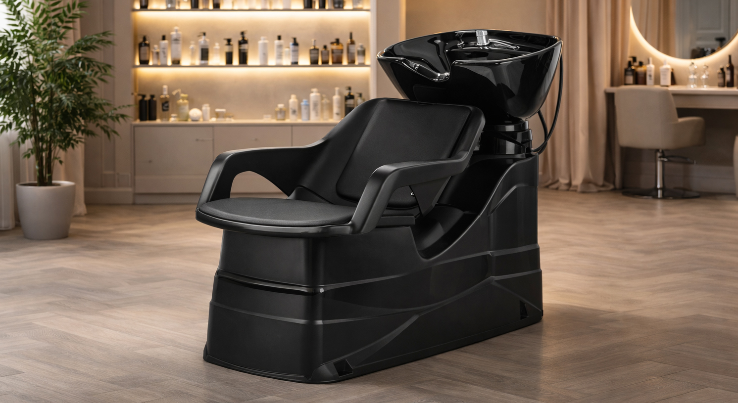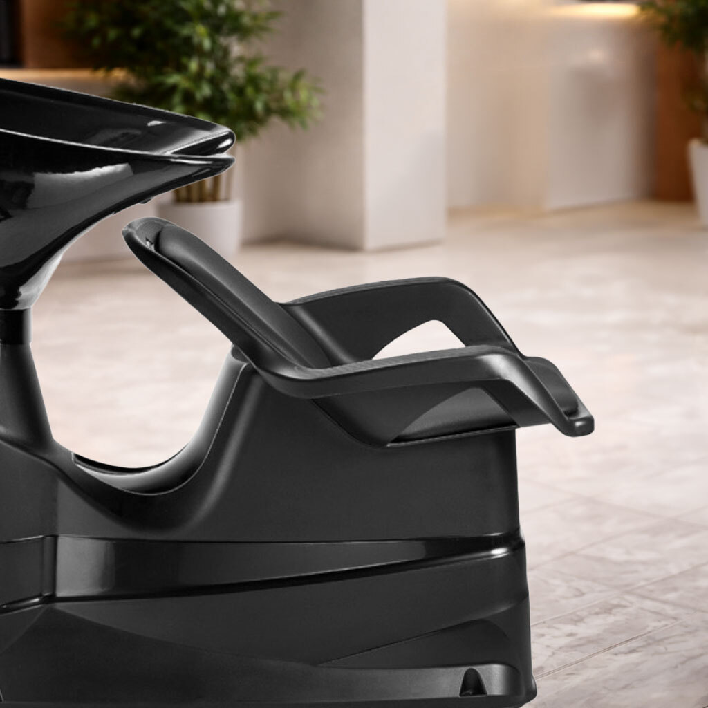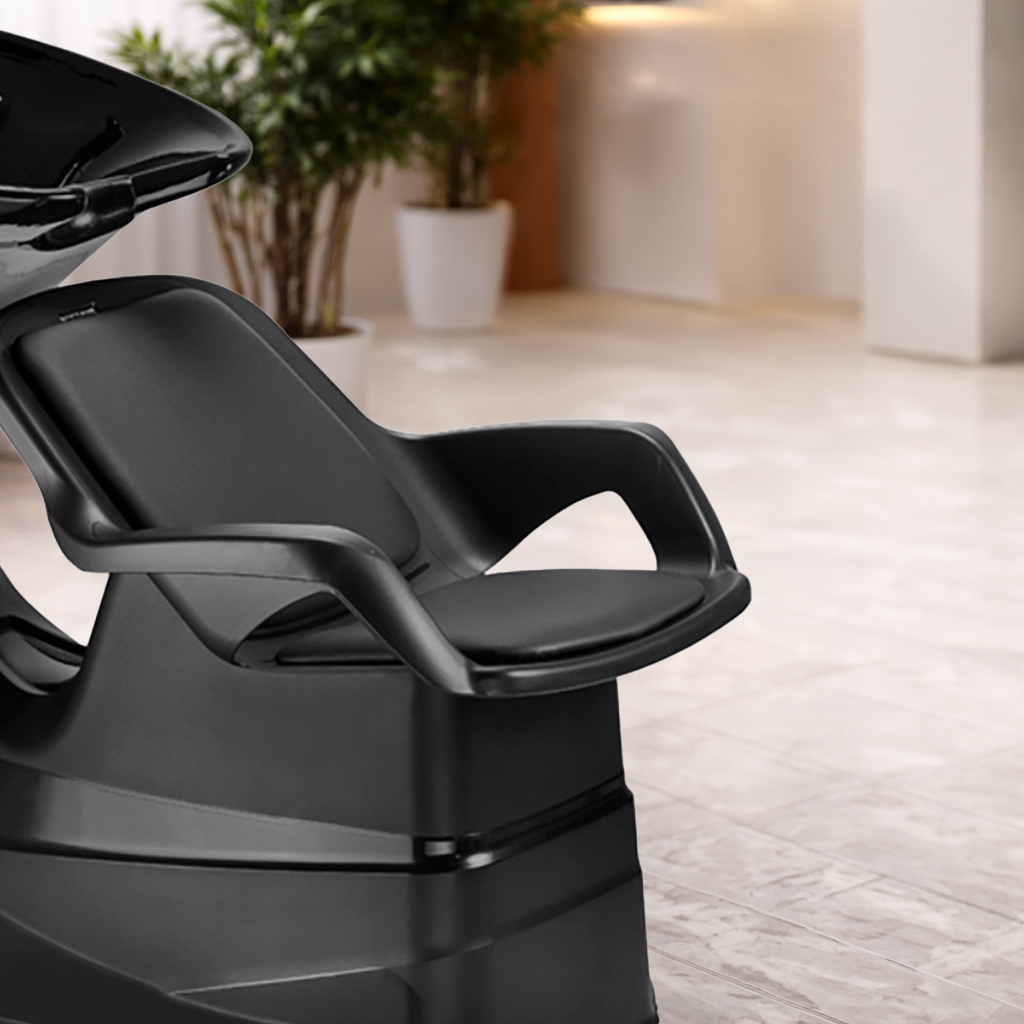 Modern, ergonomic shampoo unit featuring a sleek ceramic basin, contoured seating, and a durable waterproof structure designed for maximum comfort, efficiency, and a premium salon experience.